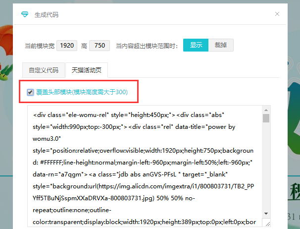 第一步:工具生成承接页全屏代码(选择天猫活动页),勾选覆盖头部模块功能,生成代码;