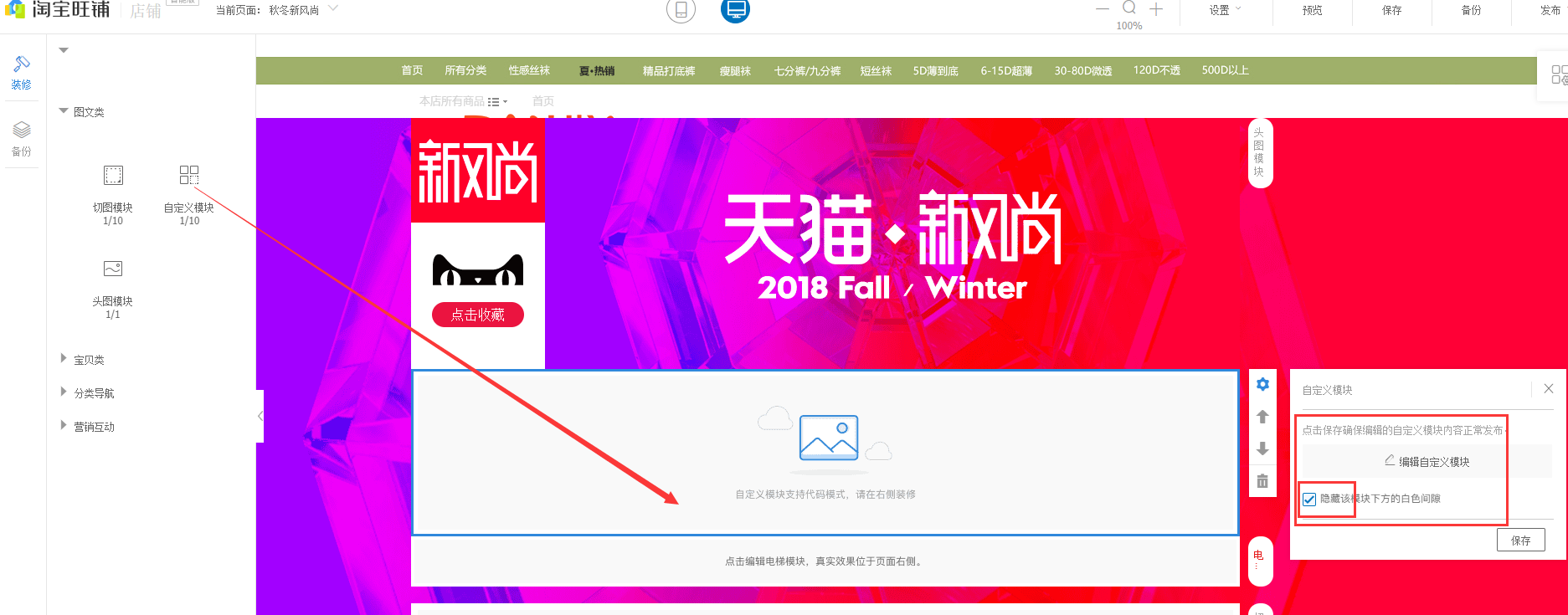:添加一个自定义模块在顶部模块下方,点击编辑,将做好的代码放入,勾选隐藏下方间隙,一定要点击保存按钮;