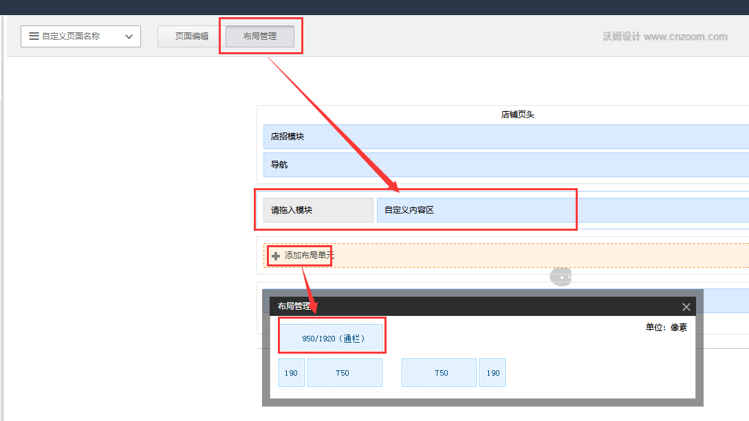 第二步:点击布局管理,查看下是否没有通栏布局,将模块加到右侧区域了;