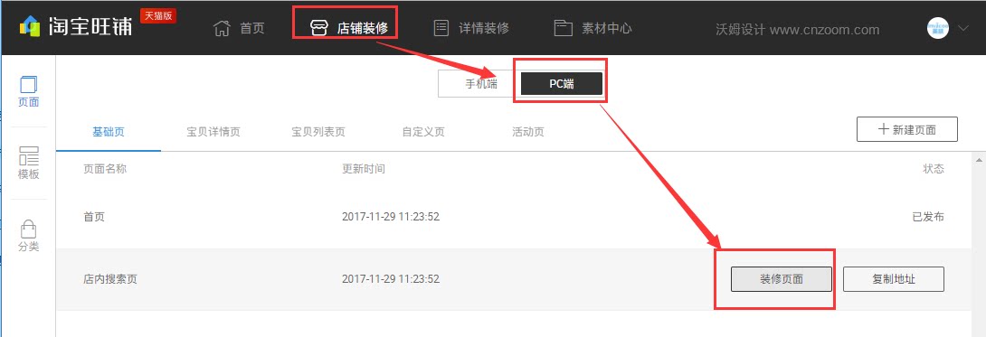 点击店铺装修—PC端,选择店内搜索页,点击装修页面;