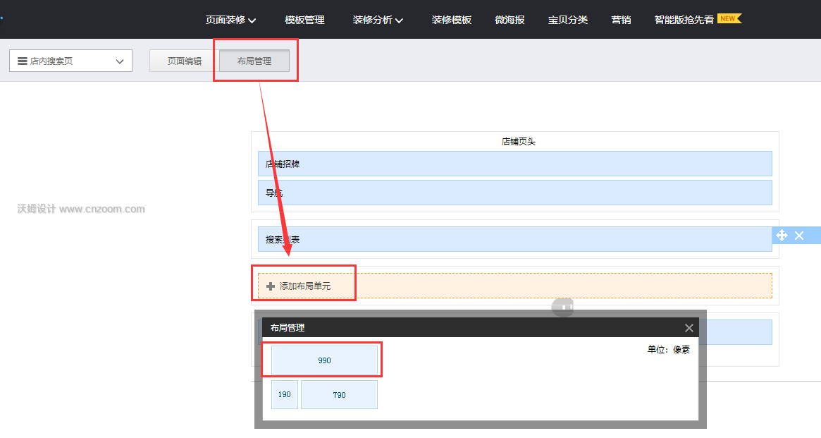 第二步:点击布局管理,添加布局单元,添加一个990区域;